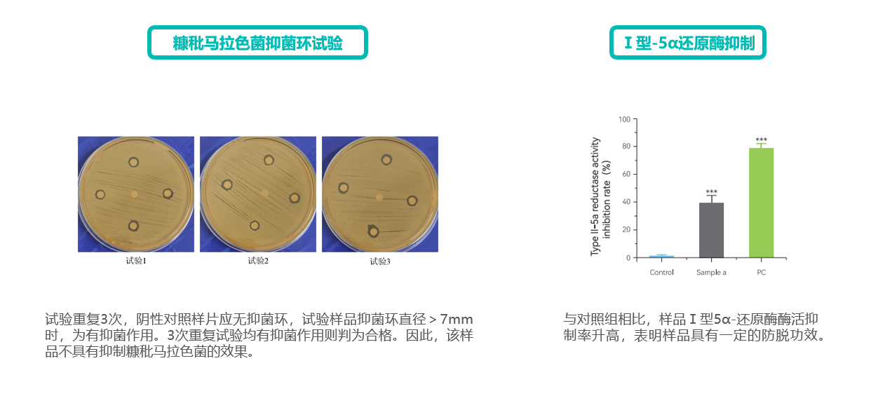 Ⅰ型5α-還原酶抑制 | 模擬雄激素引起油脂分泌增多 | 對DHT生成的抑制率 | 吸光度法 | |