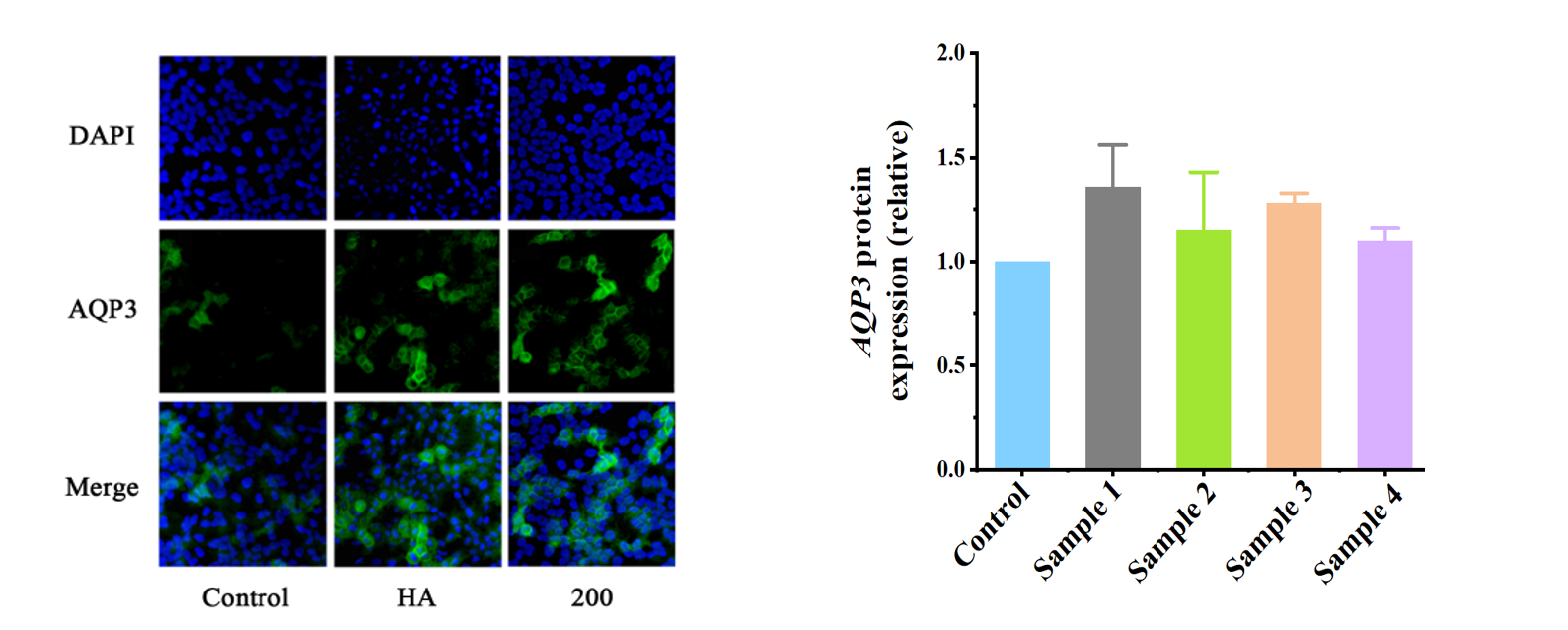 AQP3(水通道蛋白)主要參與細胞水和甘油的重吸收,AQP3表達的上調表征細胞保濕能力和屏障功能的增強。HAS3(透明質酸合成酶)主要參與透明質酸的合成,透明質酸是一種良好的保濕成分,合成越多保濕效果越好。絲聚蛋白(FLG)是角質層的重要成分,由角質形成細胞合成,并隨角質形成細胞遷移過程逐漸被酶降解為天然保濕因子等角質層需要的小分子物質,在保濕、修護和屏障完整性方面發揮重要作用。