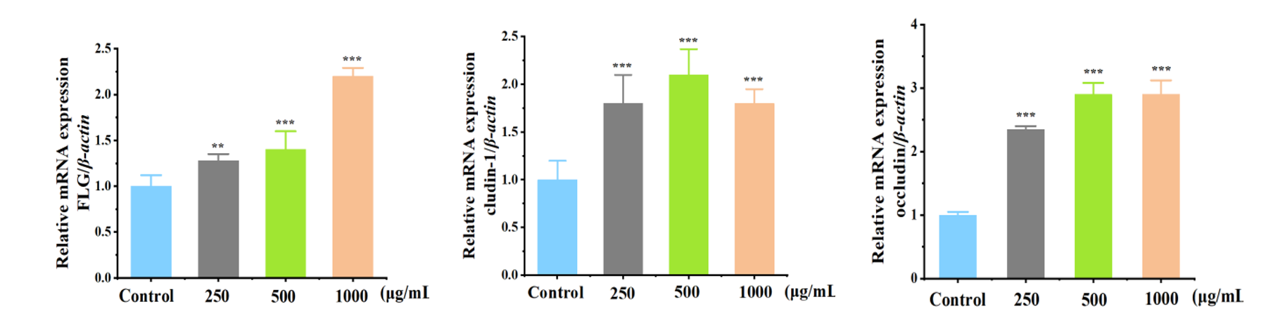如圖,與對照組相比,隨著樣品濃度的上升,屏障相關基因表達逐漸升高,表明樣品能夠有效促進細胞保濕和修護。