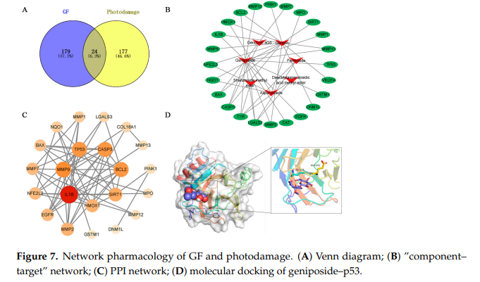 蛋白質(zhì)組學(xué)與網(wǎng)絡(luò)藥理學(xué)結(jié)合:通過(guò)DIA定量蛋白組技術(shù)發(fā)現(xiàn)G2/M檢查點(diǎn)等梔子抗光損傷關(guān)鍵靶標(biāo);運(yùn)用網(wǎng)絡(luò)藥理學(xué)分析鎖定TP53/IL1B/MMP9等核心靶點(diǎn);創(chuàng)建梔子苷-p53分子對(duì)接驗(yàn)證,為梔子提取物抗光損傷機(jī)制研究提供多組學(xué)交叉驗(yàn)證范式。