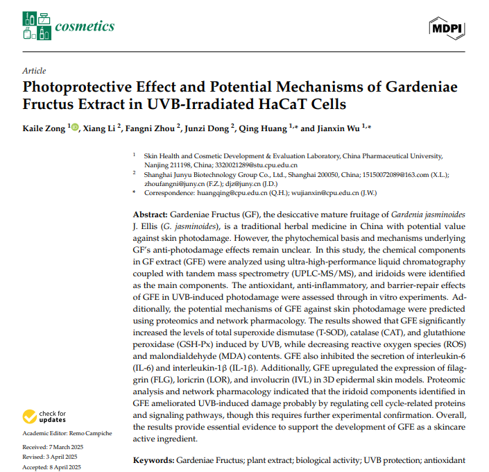 近日,杭州瑞旭科新生物技術(shù)有限公司(以下簡(jiǎn)稱“科新生物”,CIRS Biotech)與上海君裕生物科技集團(tuán)有限公司(以下簡(jiǎn)稱“君裕集團(tuán)”)聯(lián)合開(kāi)展的梔子提取物(Gardeniae Fructus Extract)抗皮膚光損傷研究取得突破性進(jìn)展。該項(xiàng)研究成果已發(fā)表于國(guó)際知名期刊《Cosmetics》(SCI收錄),為抗光損傷類化妝品功效原料的研發(fā)與評(píng)價(jià)體系構(gòu)建提供了重要科學(xué)依據(jù)。