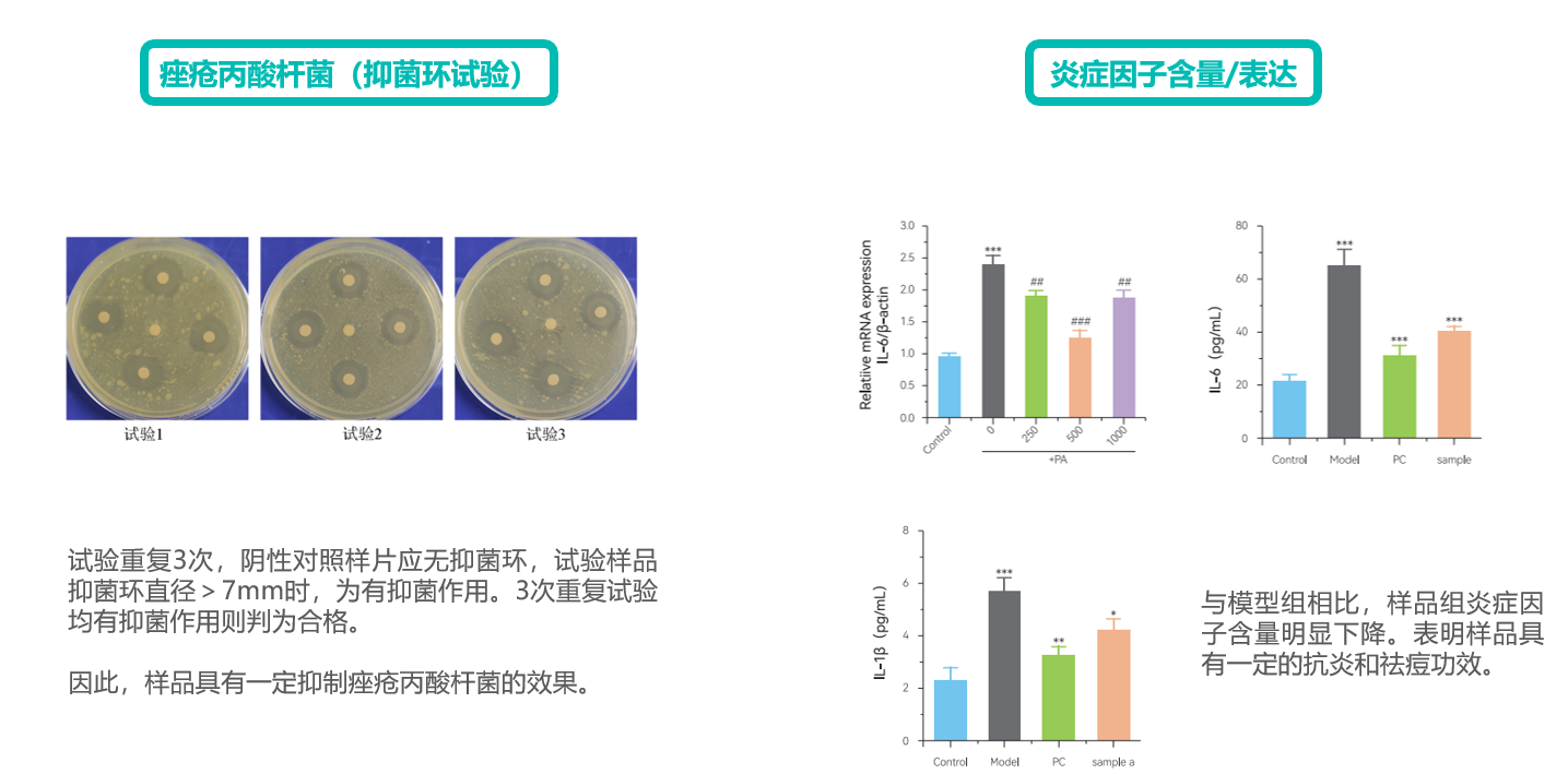 抑制痤瘡丙酸桿菌 | 抑菌 | 抑菌圈,最小抑菌濃度 | 拍照觀察 | |