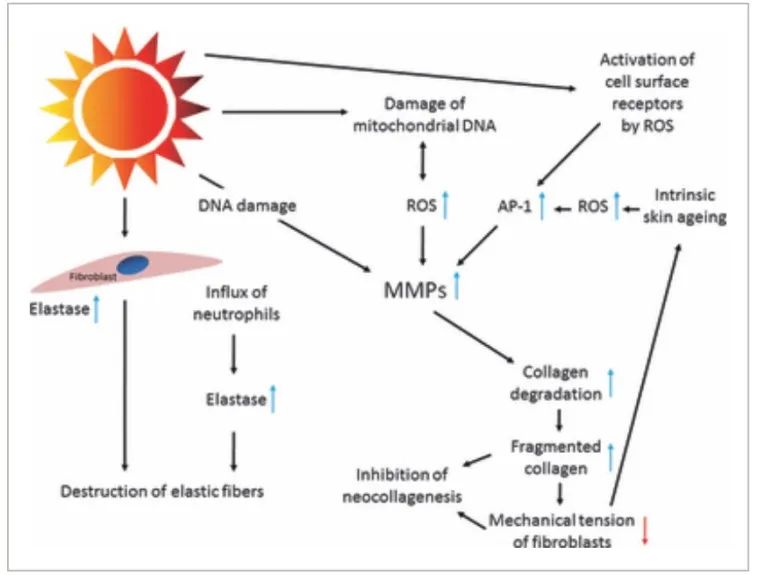 紫外線誘導的活性氧(ROS)和DNA損傷導致角質形成細胞和成纖維細胞中基質金屬蛋白酶的誘導增加。蛋白水解酶有助于ECM的降解。此外,紫外線照射直接刺激成纖維細胞中彈性蛋白酶的產生。導致部分降解的膠原蛋白和成纖維細胞的機械張力降低抑制了新膠原的發生。機械張力的降低導致ROS的進一步產生,這再次導致基質金屬蛋白酶的表達增加[4]。