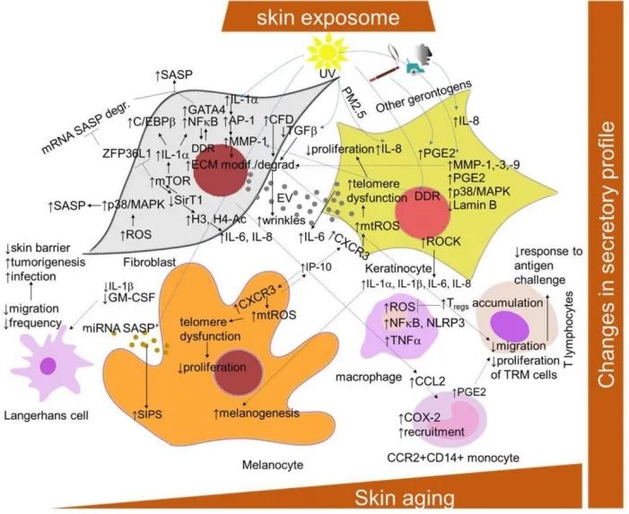 炎癥表現為血清炎癥細胞因子(如IL-6,IL-8和TNF-α)水平升高,不僅僅限于與年齡相關的全身性改變,還可能涉及皮膚老化。值得注意的是,衰老過程中積聚在皮膚中的衰老細胞在驅動皮膚發炎方面起主要作用[5]。它們表現出改變的分泌組,稱為衰老相關分泌表型(SASP),其包括促炎細胞因子,趨化因子,蛋白酶和生長因子,可顯著改變皮膚的微環境[6]。