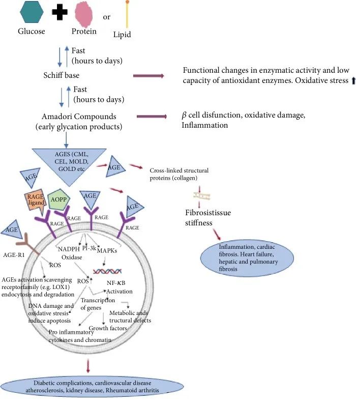 糖化反應,其實是非酶糖基化(Non-enzymatic glycation, NEG)反應俗稱糖化反應,是指還原性糖(如葡萄糖)上的羰基與蛋白質、脂質或核酸等大分子上的游離氨基之間所發生的非酶性縮合反應。糖(葡萄糖和果糖)和真皮中的膠原蛋白發生反應后,會先形成初級糖基化產物(可逆),后面會繼續形成高級糖基化終末產物(AGEs,這是不可逆的物質)。膠原蛋白在糖化反應下,結構被破壞,彈性會降低,同時又會強烈吸收紫外線,在紫外線的作用下產生更多自由基,從而導致皮膚衰老更嚴重,成為一個惡性循環[7-8]。