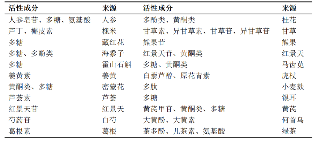 與傳統化妝品相比較,中藥來源的抗衰老成分是從植物中提取出來的天然物質,分子更細小,更容易被皮膚吸收和消化,而且不致在體內產生沉積,目前市場上已有多種來源于中藥活性成分被用于化妝品的生產(見下表)[9-10]。